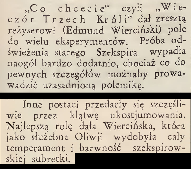 Lwów, Teatr Rozmaitości: Edmund Wierciński po raz drugi reżyseruje sztukę Williama Shakespeare'a, wystawiając Wieczór Trzech Króli pod tytułem Co chcecie. Maria Wiercińska gra rolę Marii.