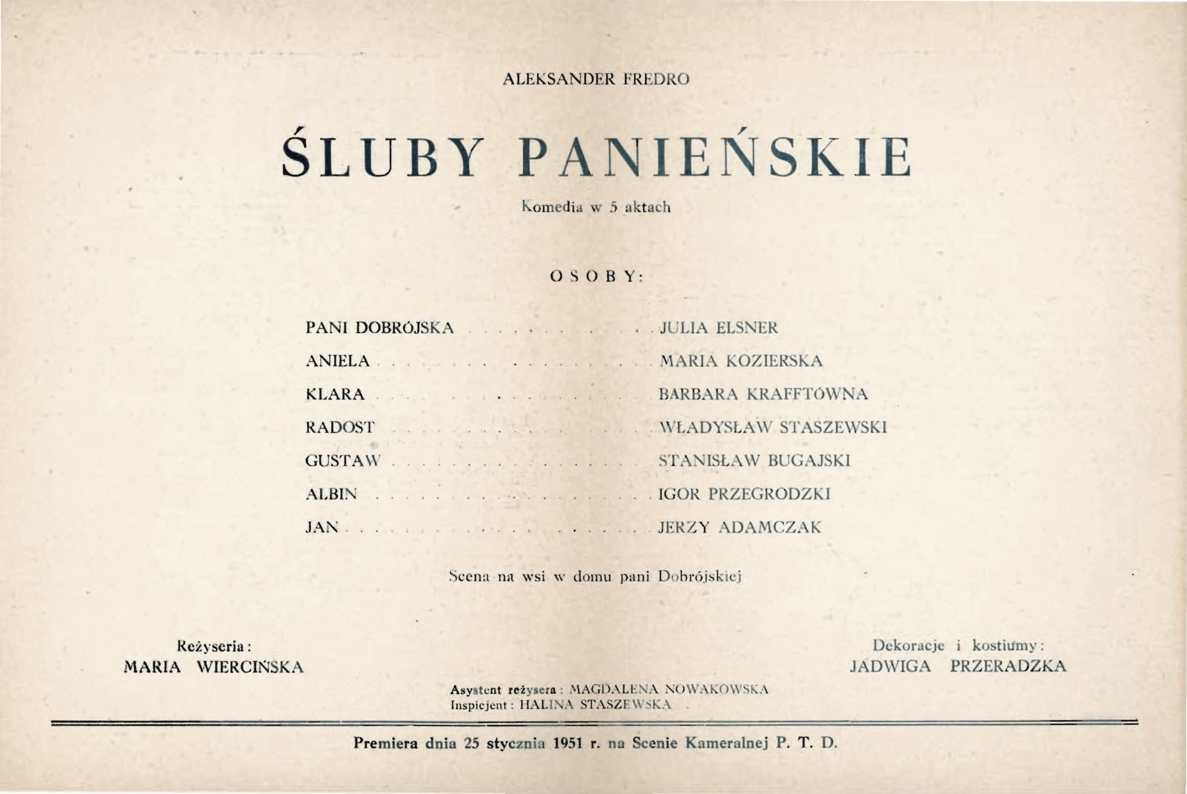 Wrocław, Państwowe Teatry Dramatyczne (Scena Kameralna): Maria Wiercińska realizuje Śluby panieńskie Aleksandra Fredry. Na podstawie tego spektaklu uzyskała „prawo reżyserowania”. W obsadzie Barbara Krafftówna w roli Klary.