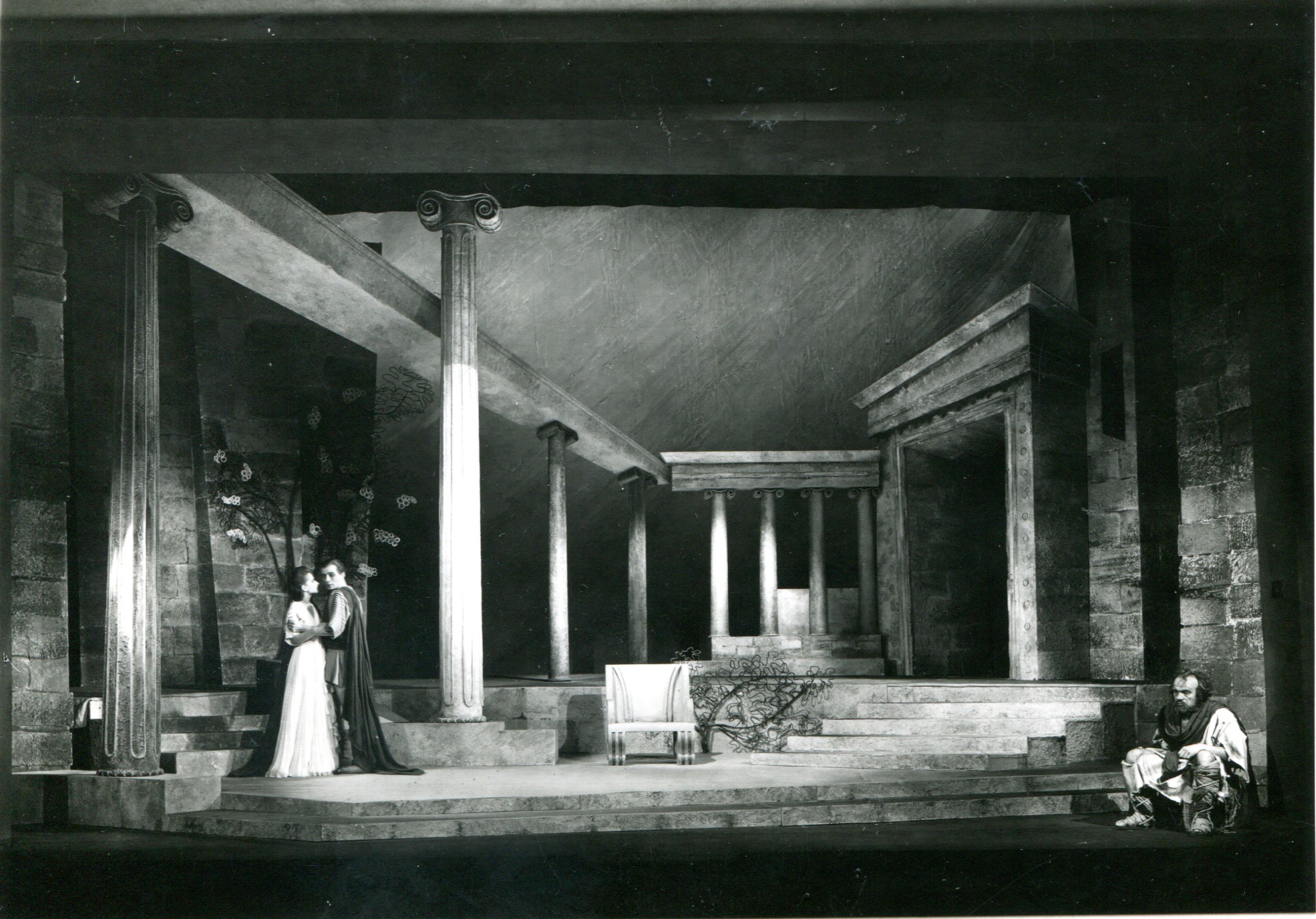Reżyser zadbał o to, by nadmiar pomysłów inscenizacyjnych nie zdominował słowa poetyckiego, choć zastosował w spektaklu zarówno elementy pantomimy, jak i maski; ważną kompozycyjną rolę odgrywała też muzyka. Gra aktorska była daleka od realizmu psychologicznego, bliższa raczej moralitetowym sensom spektaklu. Nie unikano jednak współczesnych gestów, jak choćby palenie papierosa przez jednego z bohaterów. Kostiumy w czystych kolorach, a także biżuteria i fryzury zawierały zarówno akcenty antyczne, jak i współczesne. Akcja rozgrywała się na małej scenie, która jednak zyskała głębię dzięki rzędowi kolumn skracających się pod kątem ostrym ku horyzontowi, a okalające podwórzec pałacowy schody umożliwiały akcję na trzech poziomach, przez co obraz sceniczny także nabierał głębi.